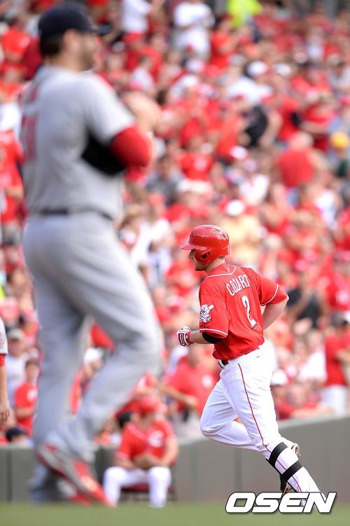 5일(이하 한국시간) 미국 오하이오주 신시내티에 위치한 그레이트 아메리칸 볼파크에서 열린 2013 메이저리그 신시내티 레즈와 세인트루이스 카디널스의 경기, 2회말 2사 1루에서 신시내티 코자트가 좌월 투런 홈런을 치고 그라운드를 돌고 있다.