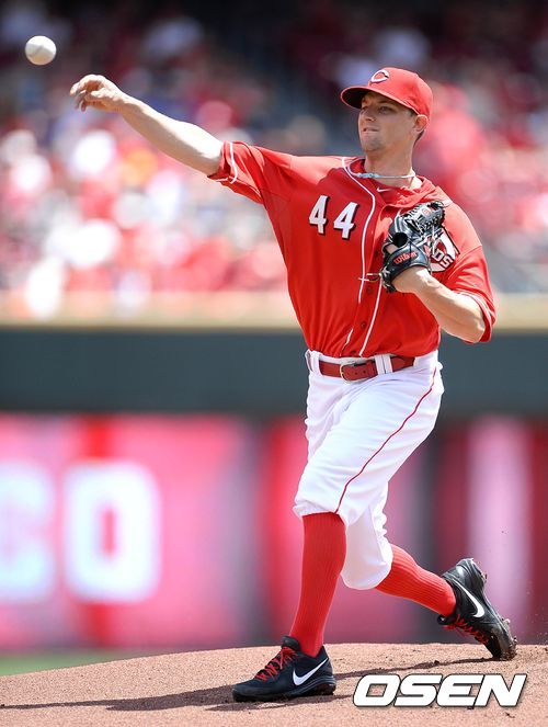 5일(이하 한국시간) 미국 오하이오주 신시내티에 위치한 그레이트 아메리칸 볼파크에서 열린 2013 메이저리그 신시내티 레즈와 세인트루이스 카디널스의 경기, 1회초 무사에서 신시내티 선발투수 마이크 리크가 힘차게 공을 던지고 있다.