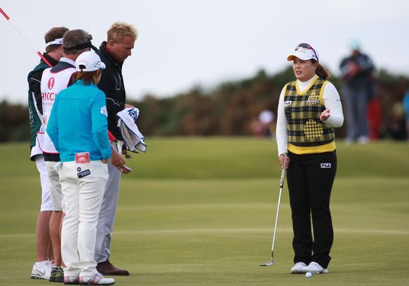 박인비가 3라운드 4번홀 그린에서 경기위원에게 바람에 공이 굴러간 상황을 설명하고 있다.