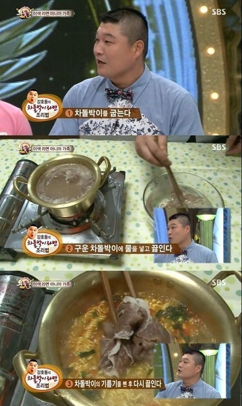 강호동 차돌박이 라면의 레시피는 차돌박이를 한 번 구우고, 끓는 물에 데쳐 기름기를 빼준 뒤 라면에 넣고 함께 끓이는 것이다. 평소 고기 마니아인 강호동은 "맛이 정말 기가 막히다"고 자랑해 웃음을 자아냈다.