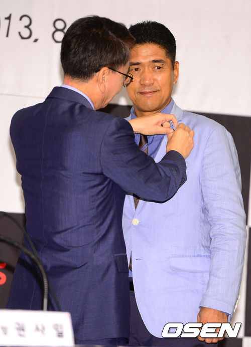 5일 오전 경기도 수원 라마다 프라자 호텔 3층 그랜드볼룸에서 열린 수원 KT wiz 조범현 초대 감독의 기자회견에서 조범현 감독이 KT 배찌를 달고 있다.