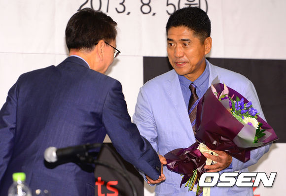 5일 오전 경기도 수원 라마다 프라자 호텔 3층 그랜드볼룸에서 열린 수원 KT wiz 조범현 초대 감독의 기자회견에서 조범현 감독이 KT 권사일 사장에게 꽃다발을 전달받고 있다