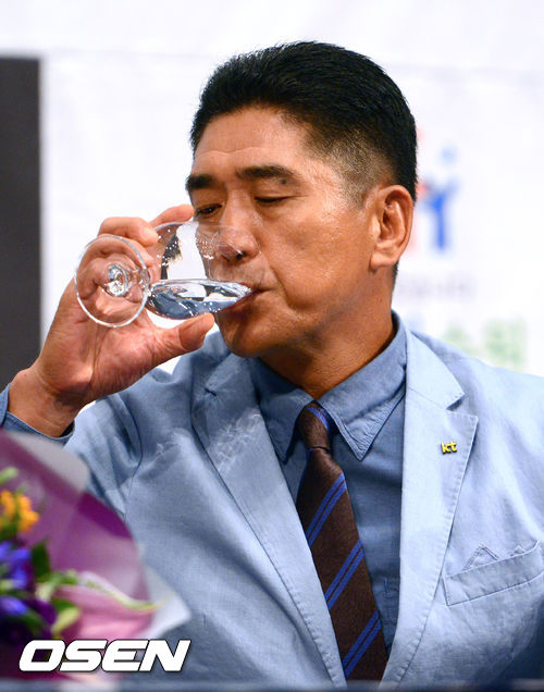 5일 오전 경기도 수원 라마다 프라자 호텔 3층 그랜드볼룸에서 열린 수원 KT wiz 조범현 초대 감독의 기자회견에서 조범현 감독이 물을 마시고 있다