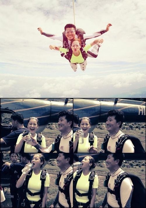 사진 속 솔비는 파란 하늘을 강사와 함께 날고 있는 모습이다. 또한 착륙해서는 기분이 좋은 듯 너털웃음을 지으며 생수를 마시고 있다.