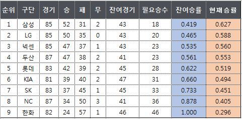 SK는 연승을 바라야 할 처지다. 6년 연속 한국시리즈에 진출했던 SK는 남은 45경기 가운데 33승을 해야 하는데 이는 승률 7할3푼3리다. 최근 가장 압도적이었던 2008년 SK의 시즌 승률은 6할5푼9리였다. 2009년과 같은 시즌 막판 19연승이 재현되길 기대하는 수밖에 없다.
