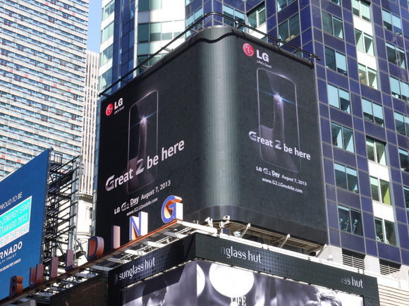 LG전자가 5일부터(이하 현지시각) 미국 뉴욕 타임스퀘어에 있는 LG 전광판을 통해 'LG G2 Day' 행사 내용을 안내하고 있다.