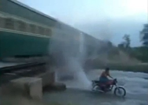 실제로는 기차를 세차하는 것이 아니지만, 오토바이서 뿜어져 나오는 거대한 물줄기가 마치 세차를 연상케 해 '기차 세차 방법'이라는 제목이 달렸다.