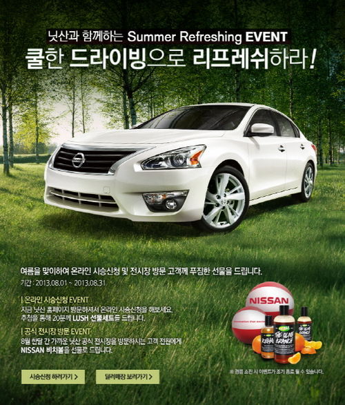 8월 한 달 간, 닛산 공식 홈페이지(www.nissan.co.kr)를 통해 온라인 시승신청을 한 운전자 중 20명을 추첨해 영국 핸드메이드 코스메틱 브랜드 러쉬(LUSH)의 올리브 브랜치(Olive Branch)샤워젤과 리햅(Rehap) 샴푸가 담긴 '러쉬 선물 세트'를 증정한다. 기간 내 전시장을 방문한 모든 이에게는 '닛산 비치볼'을 증정한다.