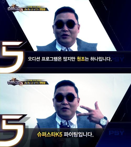 싸이는 6일 '슈퍼스타K' 공식 트위터를 통해 공개된 영상에서 "오디션 프로그램은 많지만 원조는 하나입니다"는 짧고 굵은 메시지로 힘찬 응원에 나섰다. 이어 "이번 시즌 좀 더 업그레이드 되고 멋있는 '슈스케'가 되길 기대한다"고 덧붙였다.