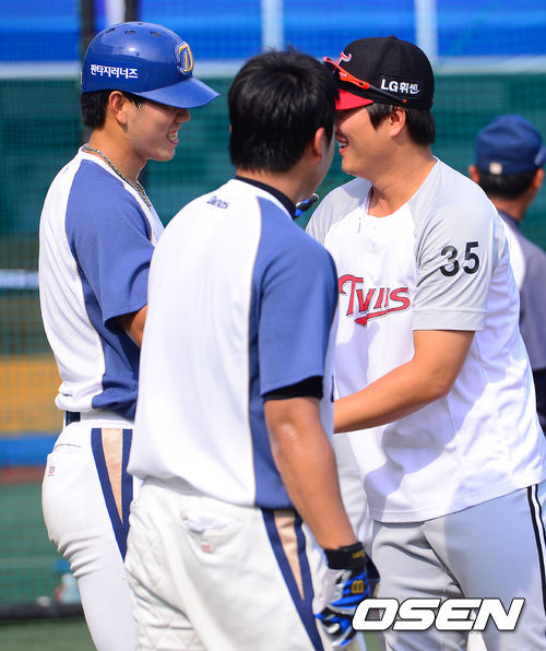 6일 오후 경남 창원 마산구장에서 열린 '2013 한국야쿠르트 세븐 프로야구' NC 다이노스와 LG 트윈스의 경기에 앞서 NC 모창민과 LG 이진영이 인사를 나누고 있다. 모창민과 이진영은 2008년 SK에서 한솥밥을 먹었다.