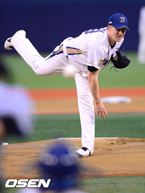 6일 오후 경남 창원 마산구장에서 열린 '2013 한국야쿠르트 세븐 프로야구' NC 다이노스와 LG 트윈스의 경기,1회초 NC 선발투수 에릭이 역투하고 있다
