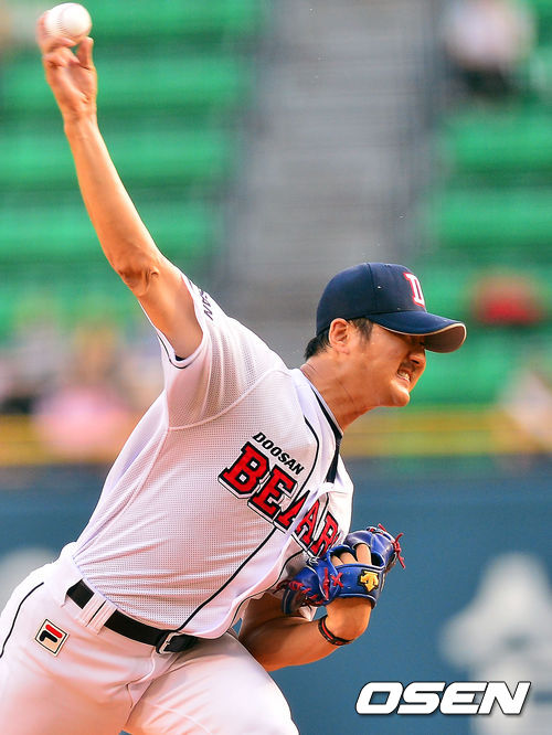 6일 오후 잠실 야구장에서 열린 2013 한국야쿠르트 세븐프로야구 두산 베어스와 넥센 히어로즈의 경기, 두산 선발 이재우가 힘차게 공을 뿌리고 있다.