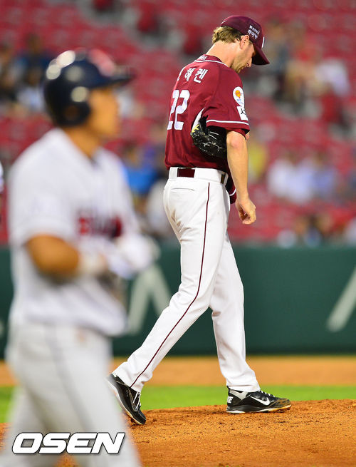 6일 오후 잠실 야구장에서 열린 2013 한국야쿠르트 세븐프로야구 두산 베어스와 넥센 히어로즈의 경기, 2회말 1사 주자 2,3루 두산 이종욱에게 볼넷을 내주며 넥센 선발 밴 헤켄이 고개를 떨구고 있다.
