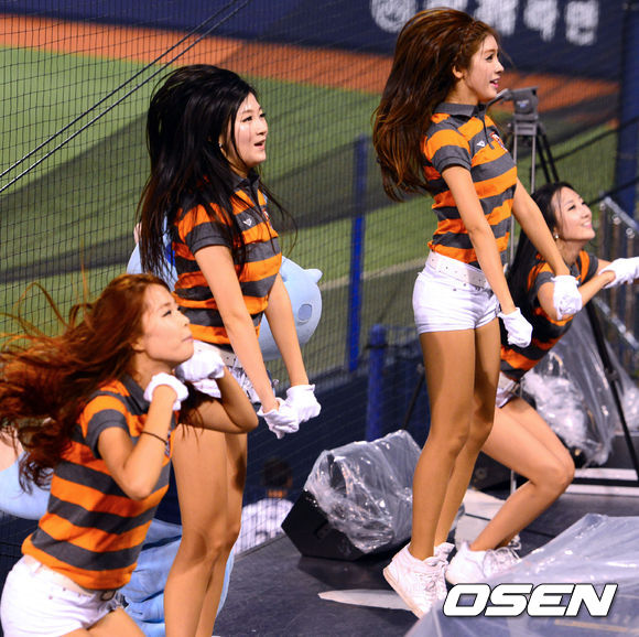 6일 오후 경남 창원 마산구장에서 열린 '2013 한국야쿠르트 세븐 프로야구' NC 다이노스와 LG 트윈스의 경기,NC 치어리더가 크레용팝의 빠빠빠 공연을 펼치고 있다.