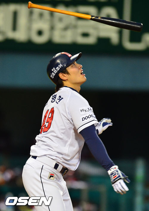 6일 오후 잠실 야구장에서 열린 2013 한국야쿠르트 세븐프로야구 두산 베어스와 넥센 히어로즈의 경기, 2회말 1사 주자 만루 두산 민병헌이 중견수 희생플라이 타구를 날리며 선취타점을 올리고 있다.