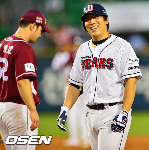 6일 오후 잠실 야구장에서 열린 2013 한국야쿠르트 세븐프로야구 두산 베어스와 넥센 히어로즈의 경기, 2회말 2사 주자 1,2루 두산 김현수가 좌익수 앞 1타점 적시타를 날린 후 1루에서 환하게 웃고 있다.