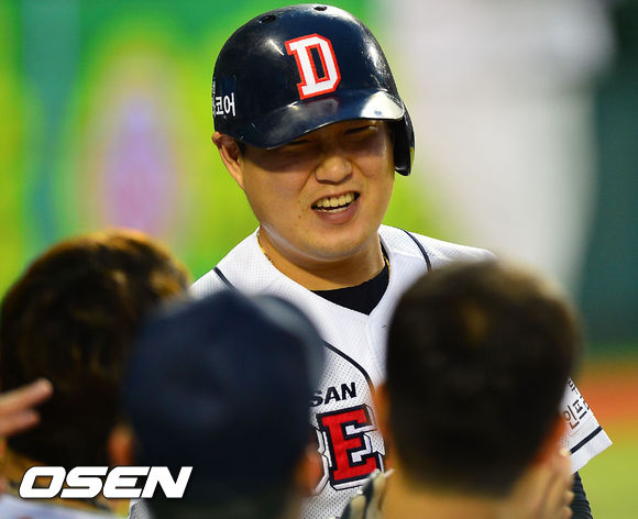 6일 오후 잠실 야구장에서 열린 2013 한국야쿠르트 세븐프로야구 두산 베어스와 넥센 히어로즈의 경기, 2회말 2사 주자 1,2루 두산 김현수의 좌익수 앞 1타점 적시타때 홈을 밟은 양의지가 덕아웃에서 동료들과 하이파이브를 하고 있다.