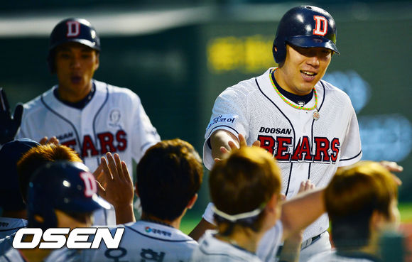 6일 오후 잠실 야구장에서 열린 2013 한국야쿠르트 세븐프로야구 두산 베어스와 넥센 히어로즈의 경기, 2회말 2사 주자 1,2루 두산 최준석의 중견수 뒤 2타점 적시타때 홈을 밟은 김현수와 이종욱이 덕아웃에서 동료들과 하이파이브를 하고 있다.