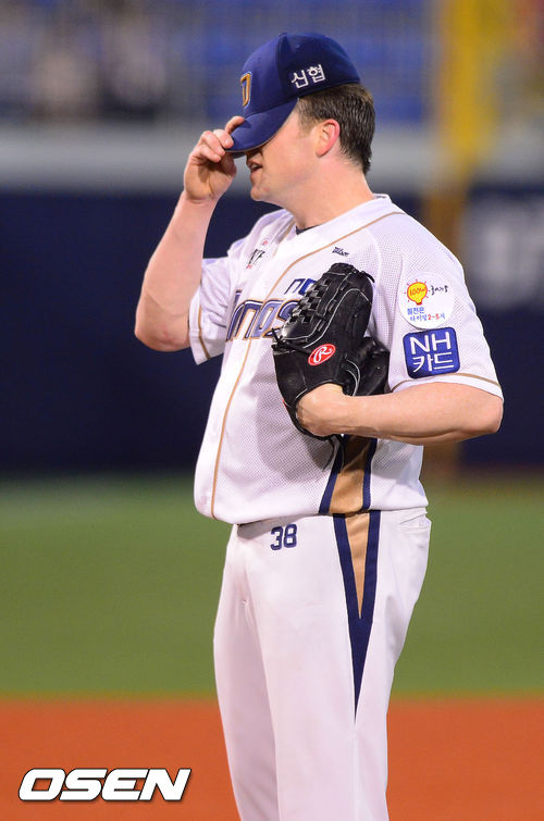6일 오후 경남 창원 마산구장에서 열린 '2013 한국야쿠르트 세븐 프로야구' NC 다이노스와 LG 트윈스의 경기, 4회까지 몸에 맞는 공 포함 5개의 사사구를 허용한 NC 에릭 선발투수가 아쉬워하고 있다
