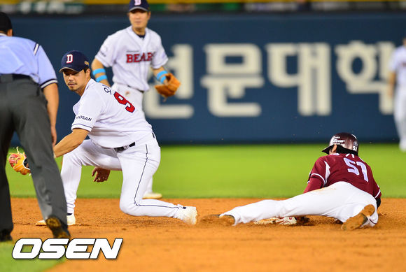 6일 오후 잠실 야구장에서 열린 2013 한국야쿠르트 세븐프로야구 두산 베어스와 넥센 히어로즈의 경기, 3회초 2사 주자 1루 넥센 박병호 타석에서 1루 주자 장기영이 2루 도루에 성공하고 있다.