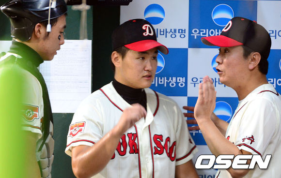 6일 오후 서울 목동구장에서 열린 '제68회 청룡기 전국 고교야구선수권대회 겸 주말리그 후반기 왕중왕전' 덕수고와 야탑고의 경기, 4회초 종료 후 덕수고 정윤진 감독이 한주성과 김재성과 이야기를 나누고 있다.