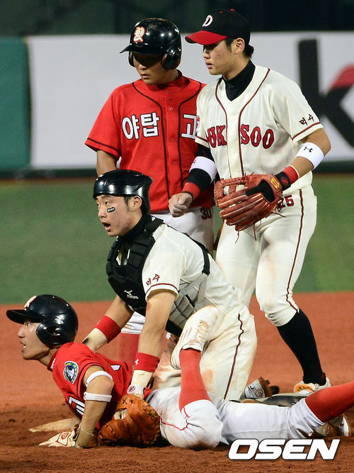 6일 오후 서울 목동구장에서 열린 '제68회 청룡기 전국 고교야구선수권대회 겸 주말리그 후반기 왕중왕전' 덕수고와 야탑고의 경기, 4회초 1사 만루 야탑고 김민호가 서상근 타석때 런다운에 걸려 3루로 귀루하고 있다. 그 사이 2루 주자 김태연이 3루 까지 진루해 아웃 당하고 있다.