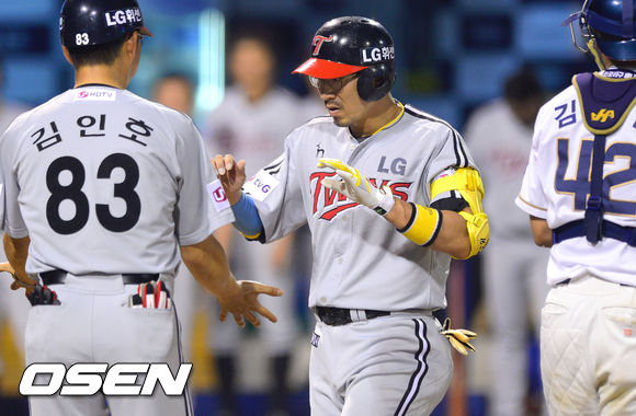 6일 오후 경남 창원 마산구장에서 열린 '2013 한국야쿠르트 세븐 프로야구' NC 다이노스와 LG 트윈스의 경기, 6회초 무사 1루 LG 정성훈이 2점홈런을 날린후 김인호 코치의 축하를 받고 있다