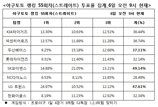 국민체육진흥공단(www.kspo.or.kr)이 발행하는 체육진흥투표권 수탁사업자인 스포츠토토 공식발매사이트인 베트맨(www.betman.co.kr)은 7일에 개최되는 두산-넥센, 롯데-KIA, 한화-SK, NC-LG 등 4경기 8개팀을 대상으로 한 야구토토 랭킹 55회차 스트레이트 게임 중간집계결과 SK(49.14%), LG(47.61%), 두산(37.11%)을 차례로 다득점 상위 3개팀으로 꼽았다고 밝혔다. 반면 롯데(32.14%), NC(28.49%)는 가장 적은 득점을 기록할 것으로 예상했다.