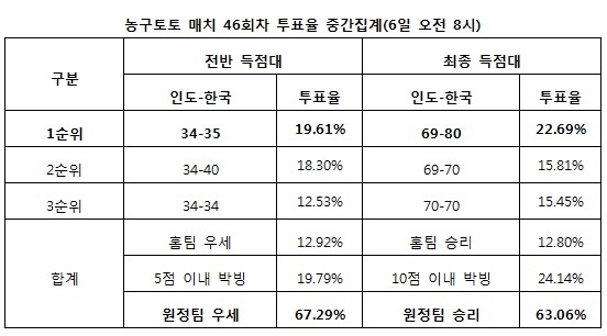 홈팀으로 지정된 인도의 승리를 예상한 참가자는 12.80%에 불과했고, 나머지 24.14%는 양팀의 10점 이내 박빙승부를 점쳤다. 전반전 역시 한국의 우세가 67.29%로 최다를 차지한 가운데, 5점 이내 박빙승부(19.79%)와 인도우세(12.92%) 순으로 나타났다.