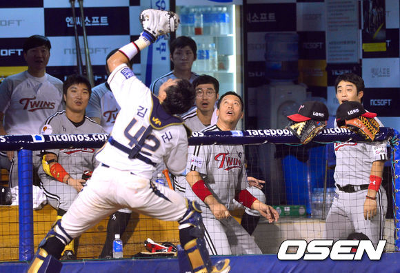 6일 오후 경남 창원 마산구장에서 열린 '2013 한국야쿠르트 세븐 프로야구' NC 다이노스와 LG 트윈스의 경기, 6회초 1사 1루 LG 윤요섭의 파울플라이때 NC 김태군 포수가 LG 더그아웃 앞에서 타구를 잡아내고 있다. 이에 더그아웃에 있던 LG 선수들이 깜짝 놀라고 있다.
