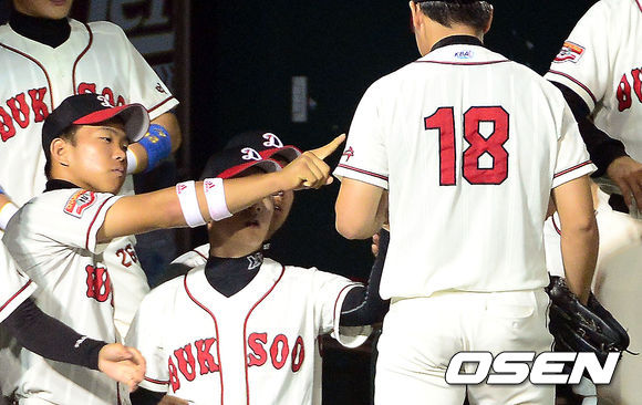 6일 오후 서울 목동구장에서 열린 '제68회 청룡기 전국 고교야구선수권대회 겸 주말리그 후반기 왕중왕전' 덕수고와 야탑고의 경기, 5회초 무사 1,2루 덕수고 한주성이 강판된 뒤 더그아웃으로 들어가면서 동료와 기뻐하고 있다.