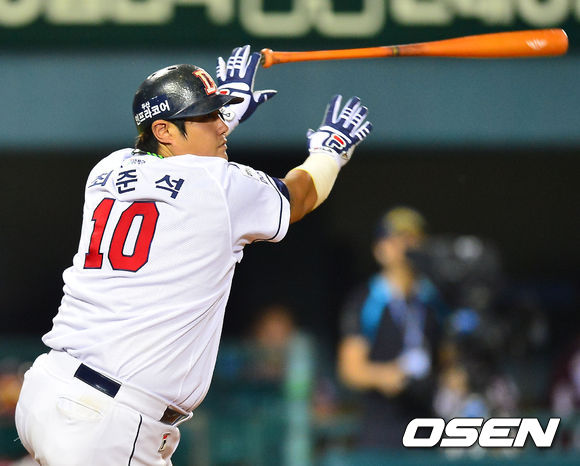 6일 오후 잠실 야구장에서 열린 2013 한국야쿠르트 세븐프로야구 두산 베어스와 넥센 히어로즈의 경기, 5회말 선두타자 두산 최준석이 우익수 오른쪽 안타를 날리고 있다.