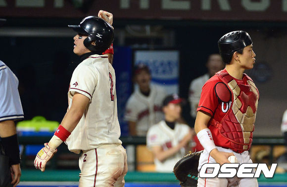 6일 오후 서울 목동구장에서 열린 '제68회 청룡기 전국 고교야구선수권대회 겸 주말리그 후반기 왕중왕전' 덕수고와 야탑고의 경기, 5회말 1사 2루 덕수고 장성훈의 안타로 득점을 올린 김재성이 기뻐하고 있다.