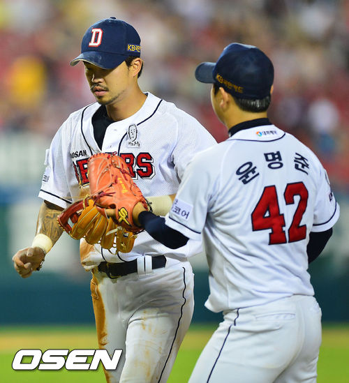 6일 오후 잠실 야구장에서 열린 2013 한국야쿠르트 세븐프로야구 두산 베어스와 넥센 히어로즈의 경기, 6회초 2사 넥센 장기영의 2루수 땅볼을 처리한 두산 2루수 오재원이 이닝을 마치고 윤명준 투수와 하이파이브를 하고 있다.