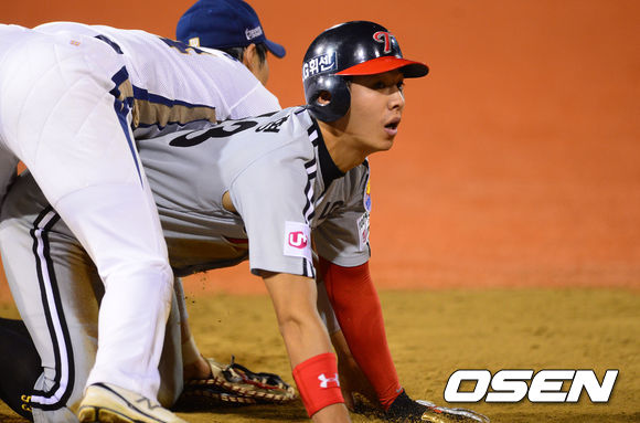 6일 오후 경남 창원 마산구장에서 열린 '2013 한국야쿠르트 세븐 프로야구' NC 다이노스와 LG 트윈스의 경기, 8회초 무사 1루 LG 이병규의 타석,1루 주자 이대형이 견제구가 뒤로 빠졌지만 1루수 이성호의 주루방해로 그라운드에 엎드려 있다.