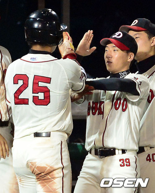 6일 오후 서울 목동구장에서 열린 '제68회 청룡기 전국 고교야구선수권대회 겸 주말리그 후반기 왕중왕전' 덕수고와 야탑고의 경기, 6회말 무사 2루 덕수고 임동휘가 김규남의 적시타로 득점을 올린 뒤 동료들과 기뻐하고 있다.