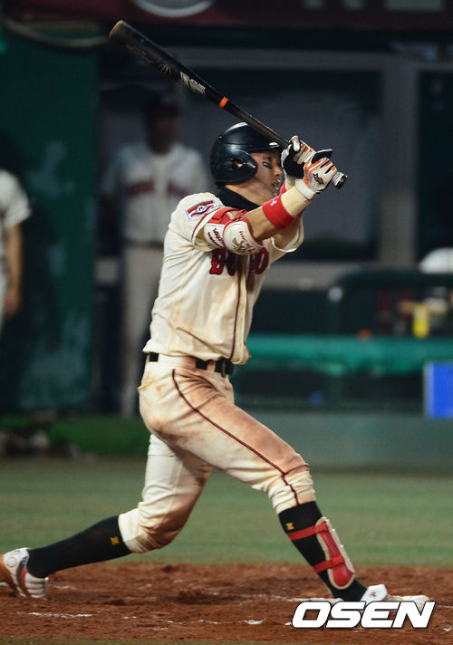 6일 오후 서울 목동구장에서 열린 '제68회 청룡기 전국 고교야구선수권대회 겸 주말리그 후반기 왕중왕전' 덕수고와 야탑고의 경기, 6회말 1사 3루 덕수고 김재성이 우익수 희생플라이를 때리고 있다.