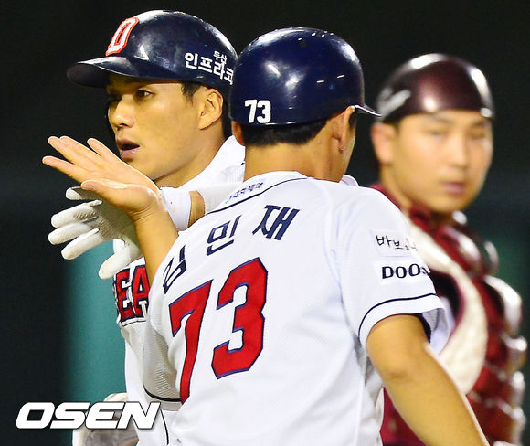 6일 오후 잠실 야구장에서 열린 2013 한국야쿠르트 세븐프로야구 두산 베어스와 넥센 히어로즈의 경기, 7회말 선두타자 두산 이종욱이 우월 솔로홈런을 날린 후 홈에서 김민재 코치와 하이파이브를 하고 있다.