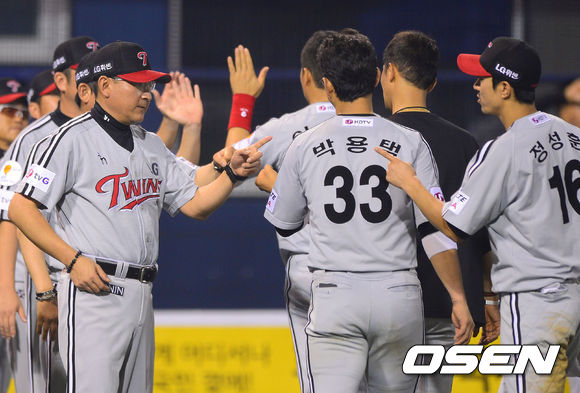 경기종료후 LG 김기태 감독이 정성훈과 손가락 하이파이브를 하고 있다./ soul1014@osen.co.kr