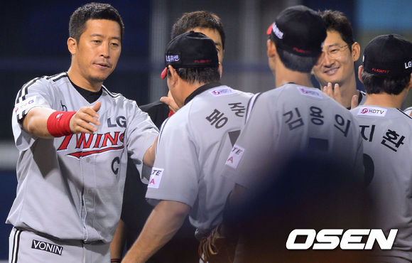 경기종료후 LG 이병규와 박용택이 마중나와 동료들을 격려하고 있다. /soul1014@osen.co.kr