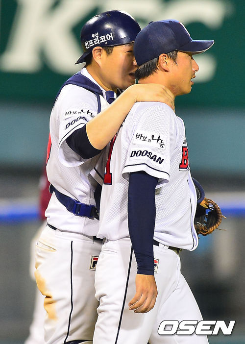 경기를 마치고 두산 양의지와 정재훈이 승리의 기쁨을 나누고 있다. / rumi@osen.co.kr