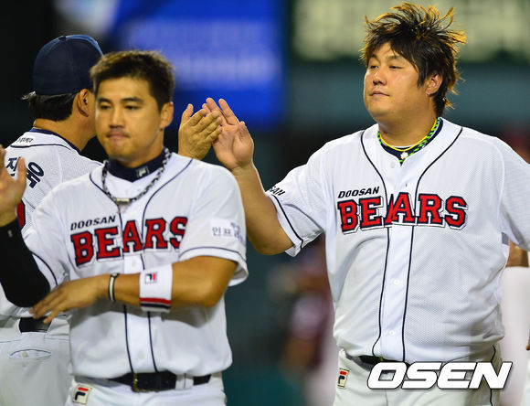 경기를 마치고 두산 최준석이 김진욱 감독과 하이파이브를 하고 있다. / rumi@osen.co.kr