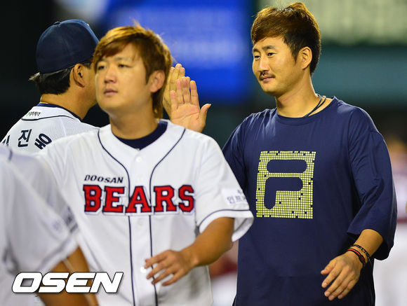 경기를 마치고 두산 이재우와 김진욱 감독이 하이파이브를 하고 있다. / rumi@osen.co.kr