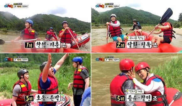 그룹 2PM 찬성과 연기자 이지훈이 KBS 2TV '우리동네 예체능' 내린천 래프팅에서 1위를 차지했다. 반면 최강창민은 래프팅 중 부상을 입어 꼴찌에 그쳤다.
