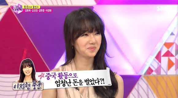 이정현은 6일 오후 방송된 SBS 예능프로그램 '화신-마음을 지배하는 자'(이하 '화신')에서 MC들로부터 "중국에서 SM, JYP, YG 3대 기획사 수입을 모두 합한 것 보다 많다고 한다"라는 질문에 대해 "아니다 한참 1집이 터지고 한국에서 번 돈이 훨씬 많다"라고 해명했다.