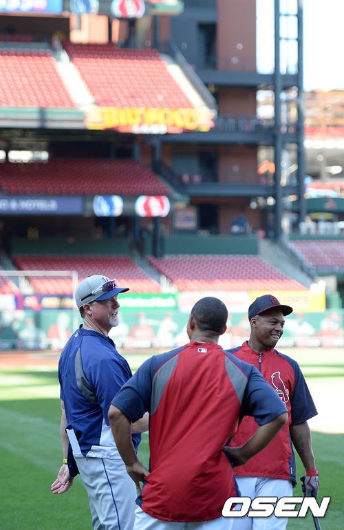 7일(이하 한국시간) 미국 미주리주 세인트루이스에 위치한 부시스타디움에서 열린 2013 메이저리그 세인트루이스 카디널스와 LA 다저스의 경기, 경기에 앞서 다저스 맥과이어 코치가 세인트루이스 선수들과 이야기를 나누고 있다.