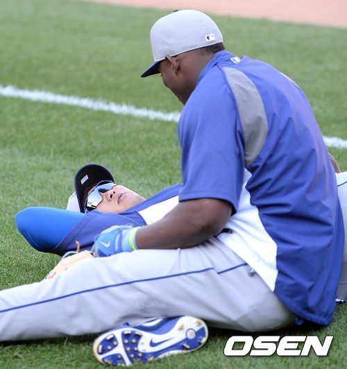 7일(이하 한국시간) 미국 미주리주 세인트루이스에 위치한 부시스타디움에서 열린 2013 메이저리그 세인트루이스 카디널스와 LA 다저스의 경기, 경기에 앞서 다저스 류현진이 푸이그와 이야기를 나누고 있다.