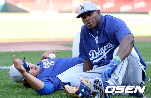 7일(이하 한국시간) 미국 미주리주 세인트루이스에 위치한 부시스타디움에서 열린 2013 메이저리그 세인트루이스 카디널스와 LA 다저스의 경기, 경기에 앞서 다저스 류현진이 푸이그와 이야기를 나누고 있다.