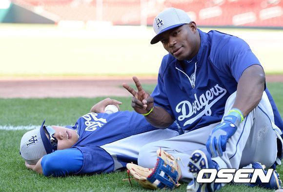 7일(이하 한국시간) 미국 미주리주 세인트루이스에 위치한 부시스타디움에서 열린 2013 메이저리그 세인트루이스 카디널스와 LA 다저스의 경기, 경기에 앞서 다저스 류현진이 푸이그와 이야기를 나누고 있다.