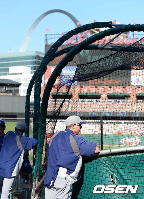 7일(이하 한국시간) 미국 미주리주 세인트루이스에 위치한 부시스타디움에서 열린 2013 메이저리그 세인트루이스 카디널스와 LA 다저스의 경기, 경기에 앞서 다저스 마크 맥과이어 코치가 타격 훈련을 하는 선수들을 바라보고 있다.